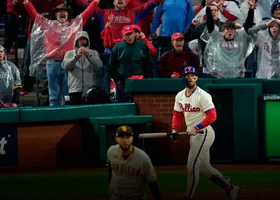 J.T. Realmuto abrió la parte baja del inning contra el relevista venezolano Robert Suárez y Harper mandó en línea un sinker de 98 mph en cuenta de 2-2 por la banda contraria. La pelota cayó en las gradas del jardín izquierdo, desatando otra vez el delirio de 45.485 aficionados dentro del estadio.