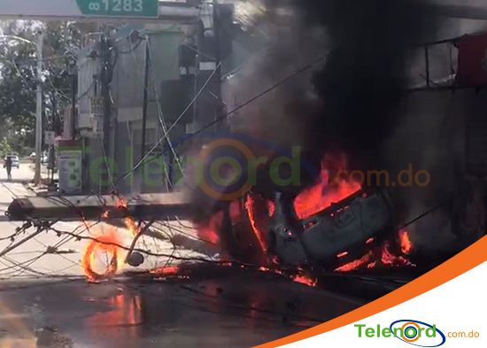 Una jeepeta se incendió tras impactar este domingo con un poste del tendido eléctrico, en la avenida Manolo Tavarez Justo, en frente de la Universidad Autónoma de Santo Domingo, recinto San Francisco de Macorís.