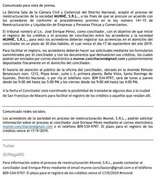 Los acreedores de la sociedad en proceso de reestructuración Munné, S.R.L., podrán solicitar información sobre el proceso al conciliador mediante el correo electrónico Esta dirección de correo electrónico está siendo protegida contra los robots de spam. Necesita tener JavaScript habilitado para poder verlo. o el teléfono 809-534-9797.