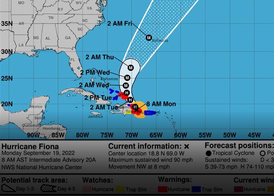 El Centro Nacional de Huracanes de Estados Unidos informó este lunes que el centro del huracán Fiona persistirá sobre el este de República Dominicana hasta esta tarde con fuertes bandas que durarán hasta la noche.