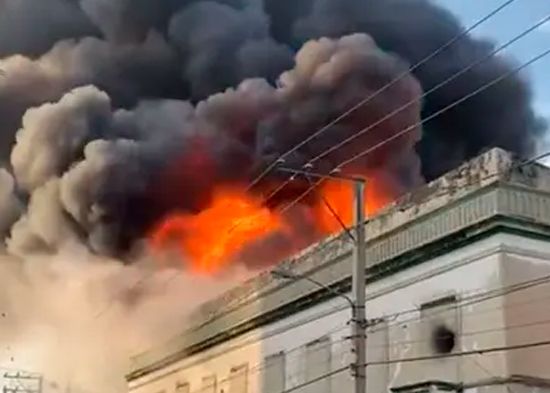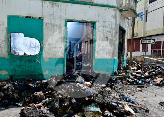 Entre escombros, telas quemadas, ropa y humo se observa lo que queda de Casa Mora, la icónica tienda de La Vega que se incendió la tarde del miércoles.
