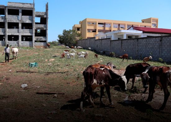 A más de cuatro meses de la denuncia de comunitarios de la existencia de criaderos en la construcción del Centro Educativo de Básica Campo Lindo, en La Caleta, Santo Domingo Este, más de 30 animales “custodian” los pabellones aún sin terminar.