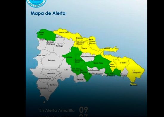 El Centro de Operaciones de Emergencias (COE) emitió, la tarde de este jueves, alerta amarilla para nueve provincias, debido a las lluvias de variable intensidad que se registran, principalmente hacia el litoral atlántico, producto de la incidencia del sistema frontal justo al norte del territorio dominicano.