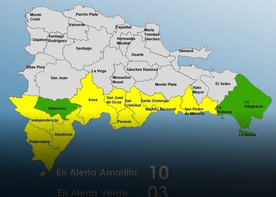 Santo Domingo.- El Centro de Operaciones de Emergencia (COE) elevó a 10 el número de provincias en alerta amarilla y mantiene tres en verde debido a la incidencia de una vaguada, que podría provocar crecidas de ríos, arroyos y cañadas, así como inundaciones urbanas repentinas.