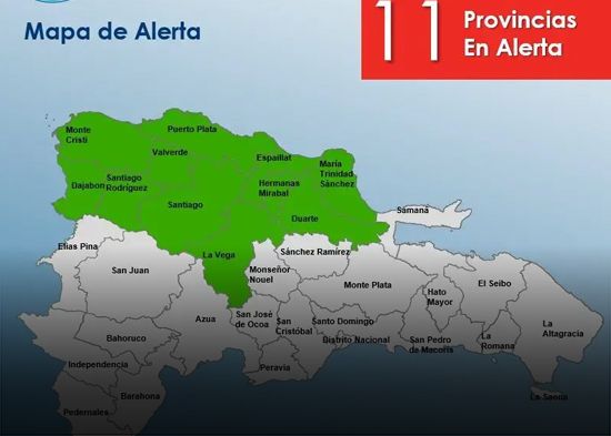 Santo Domingo.- El Centro de Operaciones de Emergencias (COE) aumentó a once las provincias en alerta verde, debido a que las condiciones meteorológicas cambiarán a partir de la tarde y durante la noche a medida que se acerque e incida sobre el país un sistema frontal.