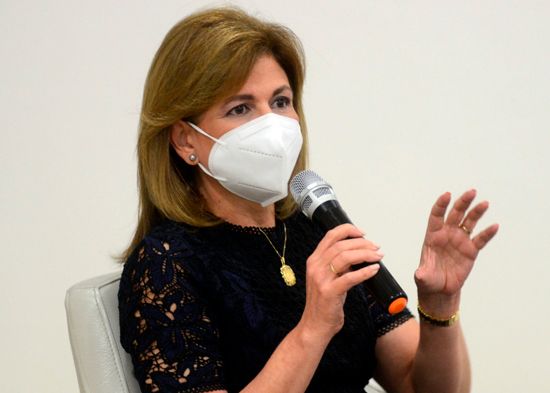 Durante su disertación, Raquel Peña agregó que gracias a las iniciativas ejecutadas a través del Programa VacunateRD, tales como, vacunación casa por casa, jornadas nocturnas, desde el vehículo, en centros comerciales, restaurantes, mercados y los 1,300 centros disponibles a nivel nacional, el 77% de la población meta original cuenta con una dosis y el 64% con dos.