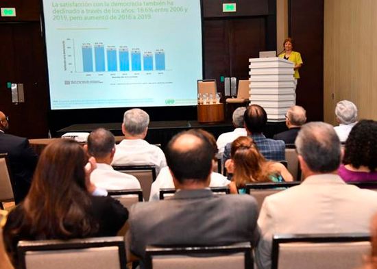 Los dominicanos han venido perdiendo confianza en las instituciones públicas, principalmente en los partidos políticos, y más recientemente, también en la gestión del Presidente, según los datos de la Encuesta del Barómetro de las Américas 2018/2019, publicados en el documento “Cultura política de la democracia en la República Dominicana y en las Américas, 2018/19: Tomándole el pulso a la democracia”. La confianza en los partidos políticos ha tenido de forma continua el promedio más bajo, cayendo a 28.4 en 2019 en una escala de 0 a 100. El promedio de la confianza en el Congreso disminuyó a 41 puntos y la confianza en elecciones cayó a solo 37.2 puntos en 2019.
