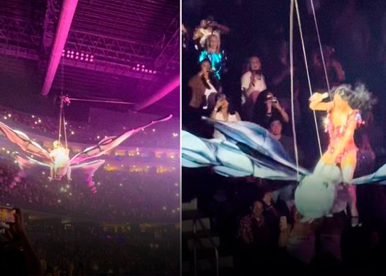 La cantante estadounidense Katy Perry casi sufre un accidente durante su presentación de la gira 'Lifetimes Tour' en San Francisco, EE.UU. La artista apareció volando sobre una mariposa mecánica, cuando de repente esta sufrió un problema técnico, que provocó que Perry casi cayera desde una gran altura.