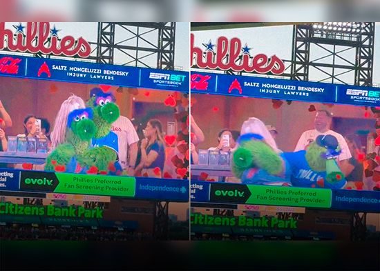 Las mascotas del equipo estadounidense de béisbol Philadelphia Phillies recrearon el momento viral de la 'cámara de besos' vivido en el concierto de Coldplay, cuando el CEO de la firma Astronomer, Andy Byron, fue captado abrazando a la directora de Recursos Humanos de esa empresa, Kristin Cabot. Las mascotas repitieron sus reacciones abochornadas, tapándose la cara con las manos e intentando esconderse.