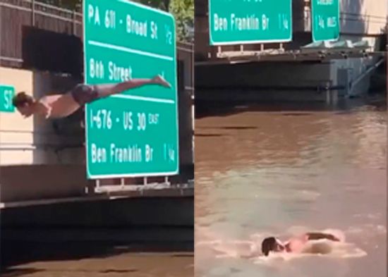 Las imágenes muestran al hombre escalando la valla de un paso elevado de la autopista en la calle 22, en el barrio de Center City. Vestido solamente con un bañador, el protagonista ejecuta una voltereta hacia atrás antes de caer de pie sobre el agua de la vía inundada.