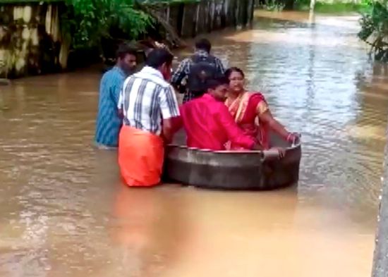 VIDEO: Una pareja llega a su boda en una gran olla, en medio de las masivas inundaciones que azotan la India