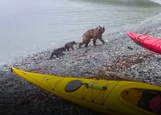 Una osa fue filmada caminando con sus cachorros por una playa en la península rusa de Kamchatka y acercándose a unos kayaks dejados en la orilla por unos excursionistas. "Tenemos a toda una pandilla de osos aquí... ¡No toques mi bote!", comenta el hombre detrás de la cámara. "Tengo a un kayakista en mi bote", agrega después.