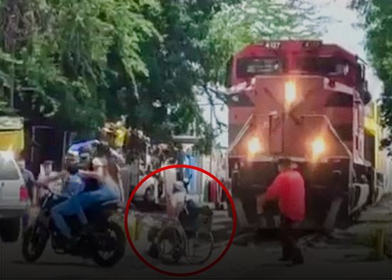 VIDEO: Salvan 'in extremis' a un hombre en silla de ruedas de ser arrollado por un tren en México