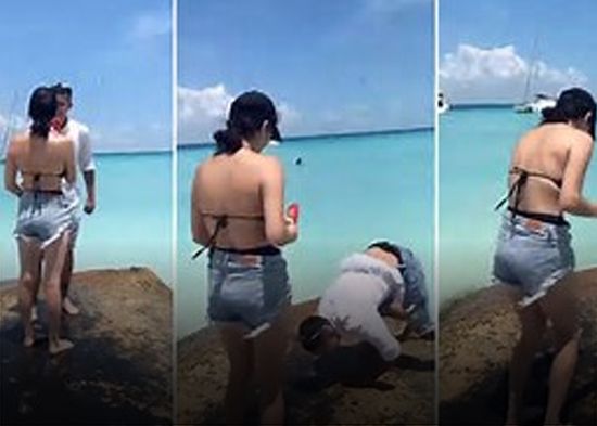 Un video que se ha viralizado en redes sociales muestra el momento en el que un hombre intenta hacerle la propuesta de matrimonio a su pareja en una roca cerca del mar, pero cuando trata de arrodillarse, se resbala y cae al agua. Entretanto, se ve a la mujer y a los testigos reír a carcajadas.