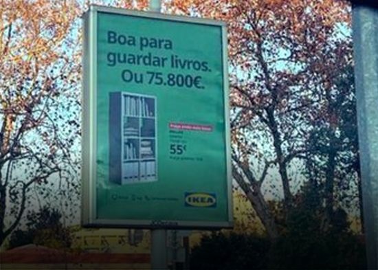 Esta semana, habitantes de Lisboa y otras ciudades lusas publicaron en las redes sociales fotografías de vallas publicitarias con el anuncio de una estantería de IKEA con el mensaje: "Buena para guardar libros. O 75.800 euros", en una clara alusión a la cantidad de dinero en efectivo encontrada oculta en sobres en una estantería durante el registro del despacho de Vítor Escária, exjefe de Gabinete de Costa.