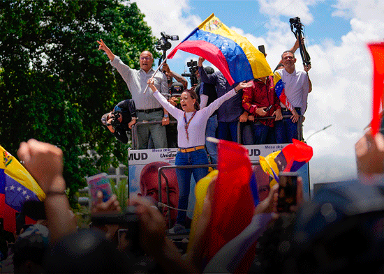 Las imágenes aéreas muestran las inmediaciones de Las Mercedes, una pudiente zona del este de Caracas, donde los simpatizantes de la oposición rodearon el camión desde donde Machado expresó su discurso. Después del pronunciamiento, la política –que asegura que está en la clandestinidad– se retiró sin ningún inconveniente.