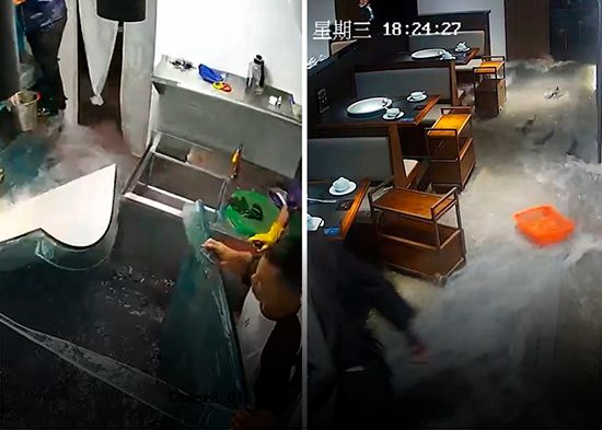 En las redes se ha divulgado un video que captó el momento en que una enorme pecera se rompió repentinamente en un restaurante chino, inundando por completo el comedor con decenas de peces vivos. Según se ve, el personal se desconcertó por un momento al no saber cómo actuar ante el incidente.