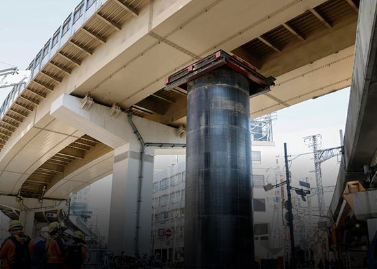 Overnight, a massive underground pipe pushed up from the ground under an elevated road in Umeda.