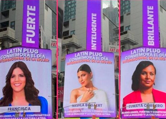 Las actrices Francisca, Nashla Bogaert y la productora de cine Zumaya Cordero debutaron la mañana de este martes en la pantalla de Time Square por motivo del Dia Internacional de la Mujer donde las dominicanas fueron descritas como fuertes, inteligente y brillante respectivamente.