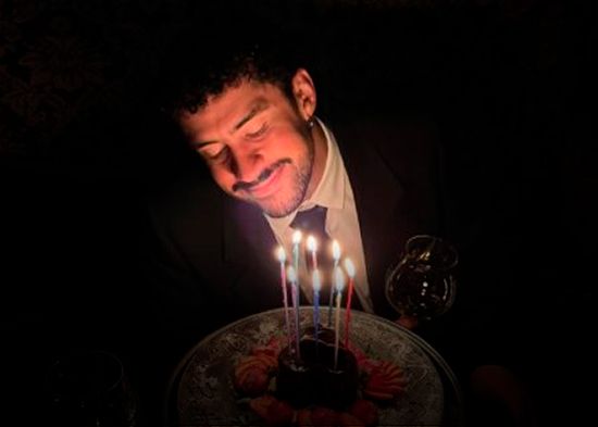 El “Conejo Malo” compartió una fotografía en la que aparece sonriente y elegante, vestido con traje oscuro y camisa blanca, frente a un postre en forma de corazón de chocolate adornado con fresas frescas y varias velas encendidas. La imagen, captada en un ambiente íntimo y sofisticado con iluminación tenue y copas de fondo, refleja la sencillez que caracteriza al artista. La publicación lleva únicamente como pie de foto el número “32”.