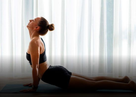 Bhujangasana (Postura de la cobra): Esta postura fortalece los músculos abdominales y alivia la rigidez de la parte baja de la espalda, facilitando el flujo de sangre a los órganos digestivos. Se hace poniéndote boca abajo y levantando únicamente la parte superior del cuerpo sosteniéndote con los brazos.